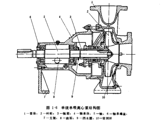 單級單吸離心泵常為臥式,它的結構如圖1-6所示。由葉輪、泵體、泵軸和軸承、軸封等主要部分組成,現分述于下。